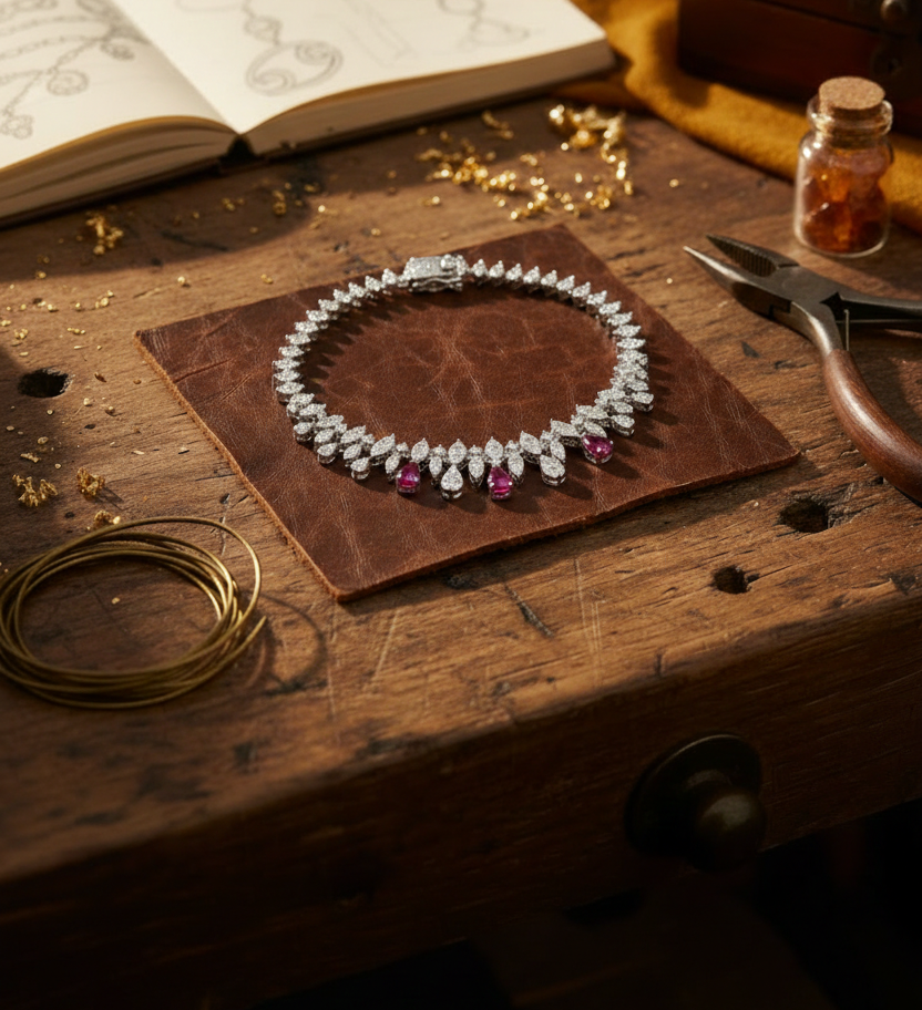 En son centre, un motif spectaculaire se révèle : une double rangée de diamants simulés taille marquise, sublimée par une troisième rangée de rubis de laboratoire en forme de goutte.